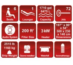 - 7 hydro-massage seats including 1 step/higher elevation seat, 1 stand up massage seat, 1 no-float lay down seat, a 10ft dedicated swim area capable of accommodating 8 more bathers/1 active swimmer and 71 powerful jets including 5 high current swim jets for a great massage and strong swim