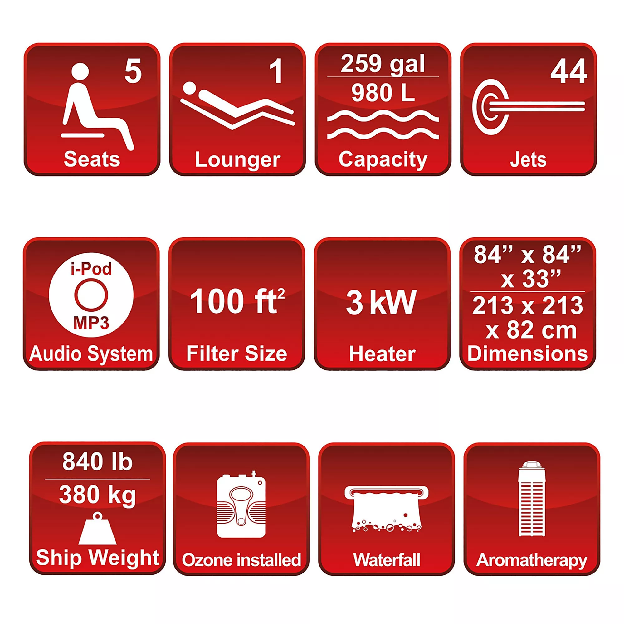 The Toronto special edition spa has something for everyone – a sculpted therapy seat, a roomy lounger and a corner nook for friends. It features forty four jets with adjustable air controls for added pressure and a built-in aromatherapy system. There’s room for up to six people to unwind in the Toronto hot tub.