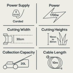Electric hover collect lawnmower with convenient grass box vision window, cable storage and neatly folds away.