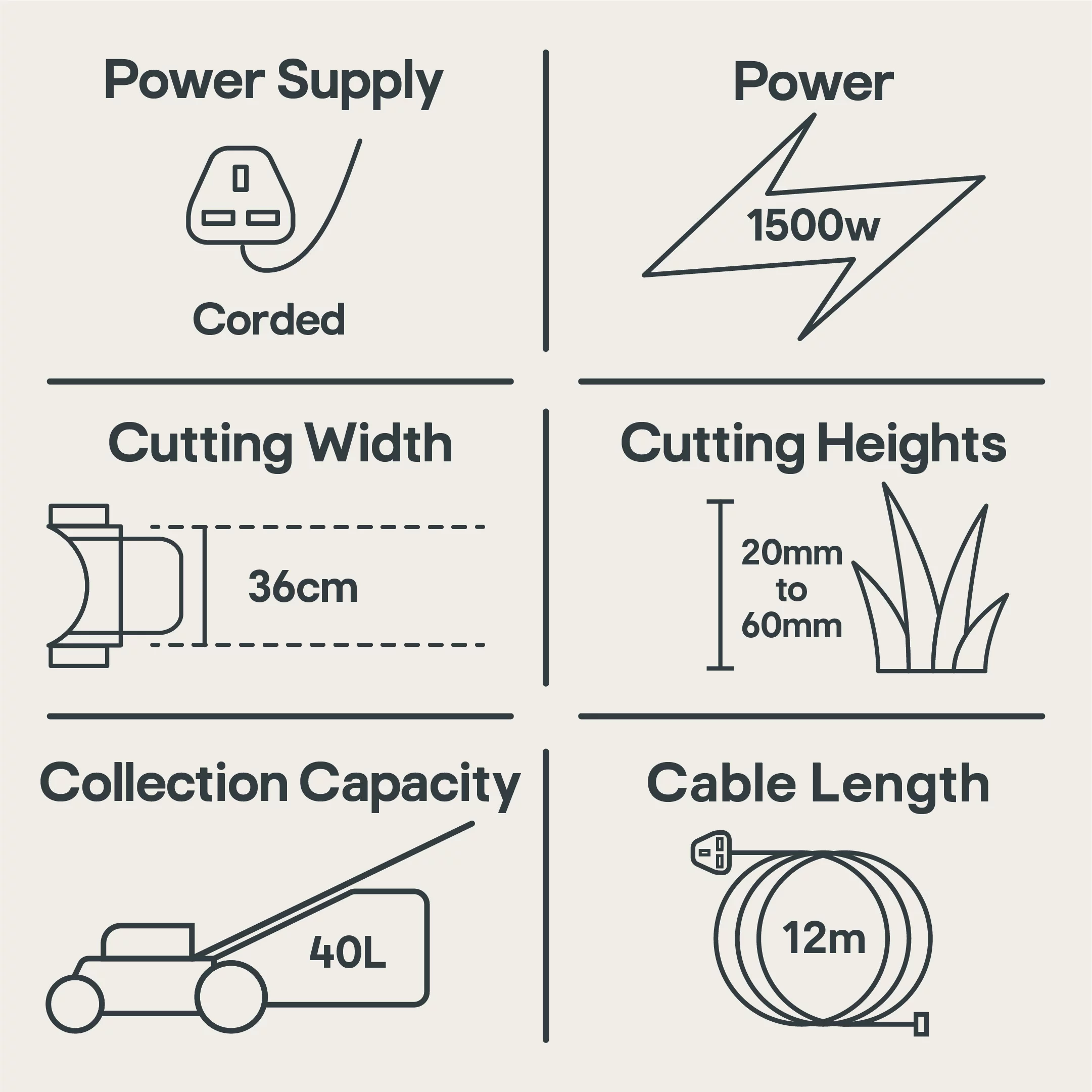 Designed for medium to large gardens, the Flymo Speedi-Mo 360C is a 36cm electric wheeled rotary lawnmower with powerful 1500W motor. Equipped with central height adjust, a large easy to empty 40L grassbox with vision window, and comfortable dual lever handles.