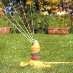 The ultimate 2-in-1 lawn and garden sprinkler – features a jet spray for lawns and a fine spray for seedlings.