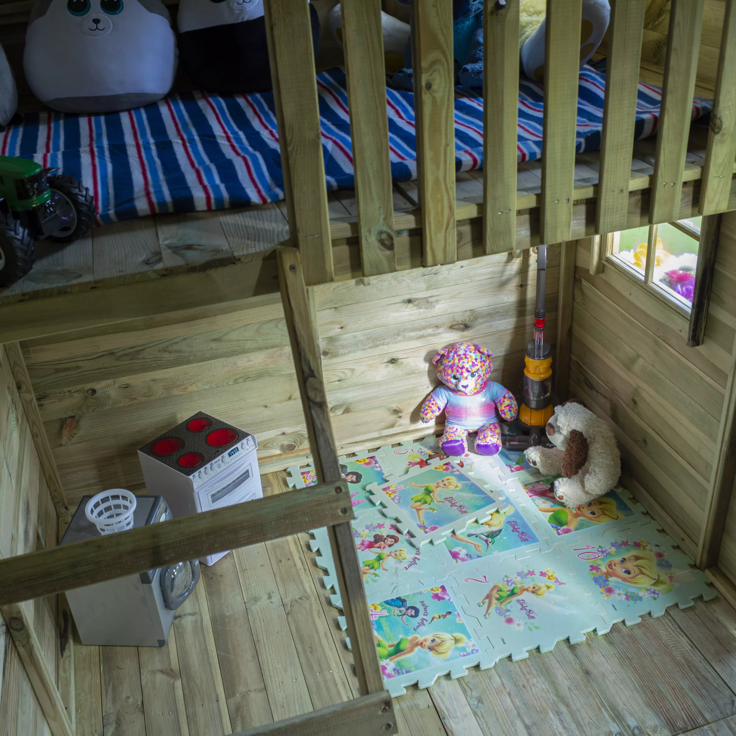 Designed to inspire your childrens imagination, the Rowlinson Country Cottage Playhouse is ideal for letting your childs imagination create any world they want, full of adventure and fun. This Country Cottage has six fixed styrene glazed windows, and an upstairs platform accessible by ladder, giving your children plenty of room to play. The countryside theme continues with three window boxes, dormer upstairs, miniature chimney and a stable-style front door.