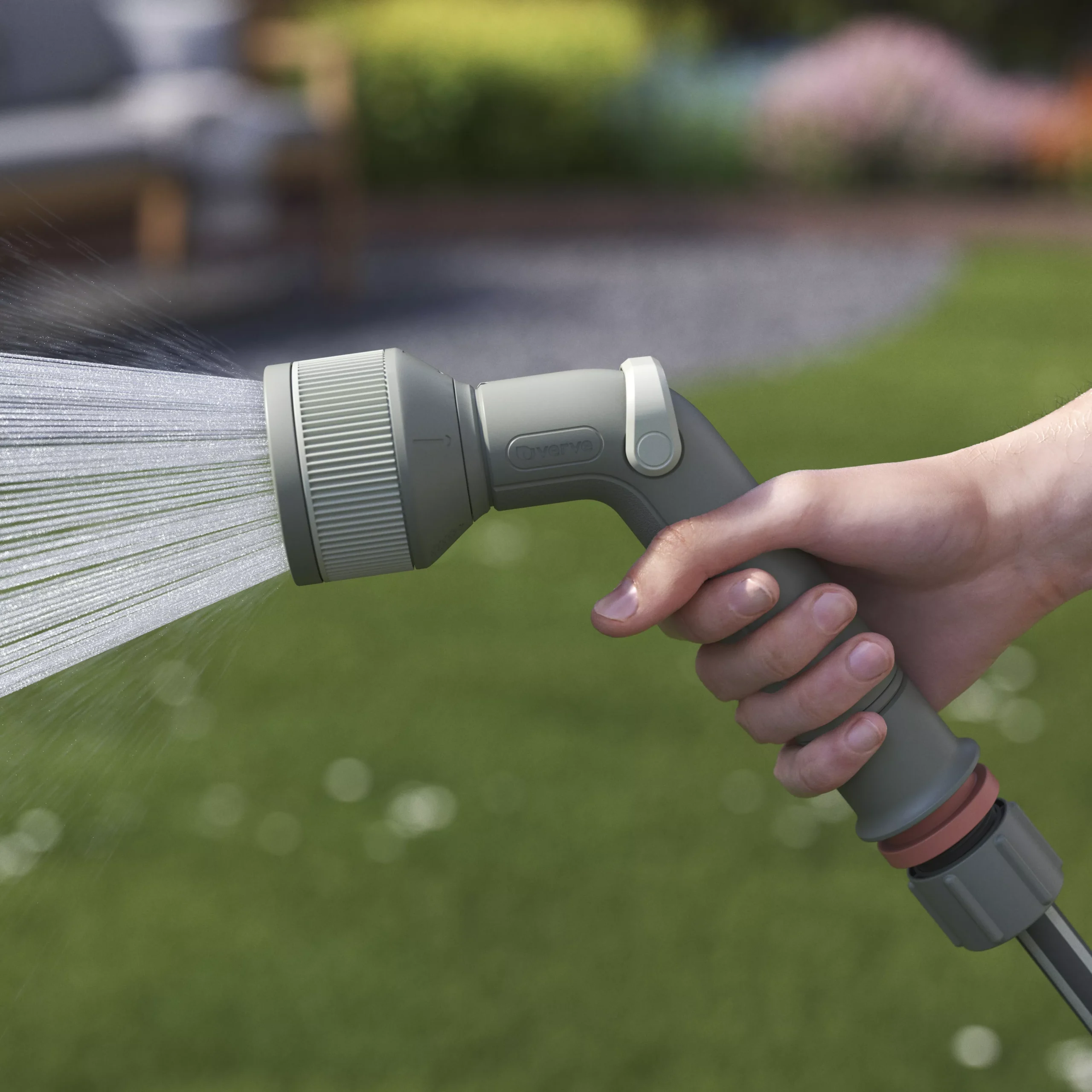 The Verve multi spray gun has a light, ergonomic design that is easy to control with thumb movement allowing you to choose the right flow for your task. Twist the head to select your desired setting. The Verve connectors form an extension to the handle allowing for comfortable watering.